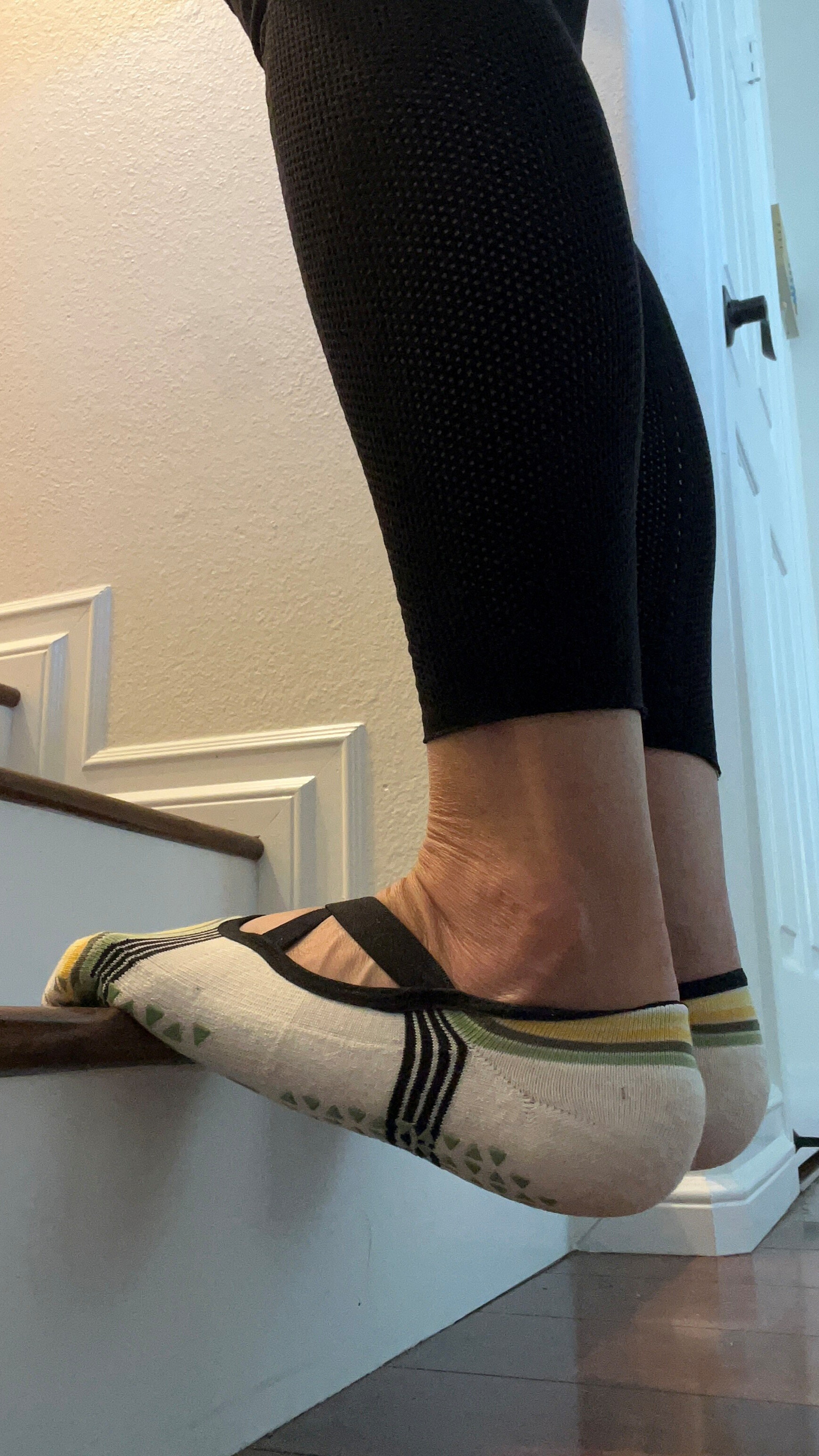 - Holding onto a bannister or wall for support, stand on a step with your feet shoulder-width apart, allowing your heels to hang off the edge.