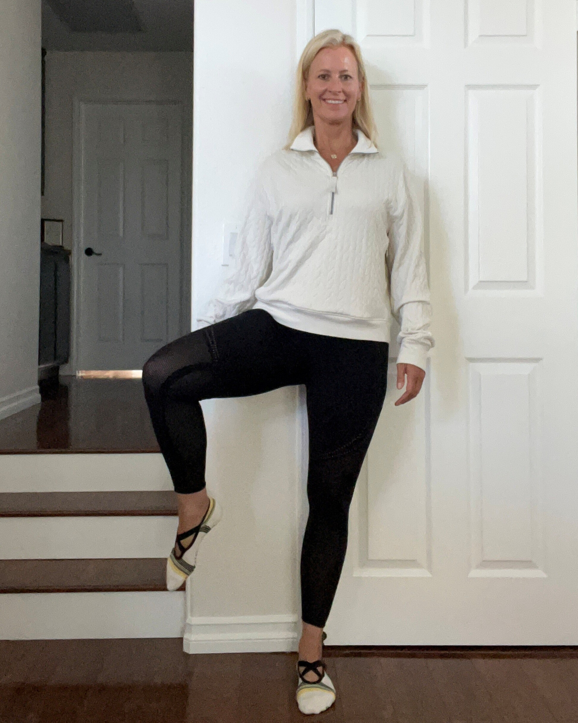 - Step down onto the floor and roll your ankles outward and inward.