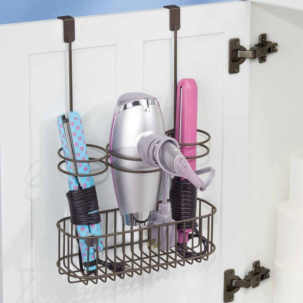 Having a specific spot for hair tools (that isn’t scattering them all over your countertop) feels like such a luxury. Fortunately, this organizer gives you slots for three different tools like hair dryers and curling irons that are otherwise awkward to store. It hangs right on your bathroom cabinet door, and it has a heat-safe basket on the bottom to keep all of the cords tidy.