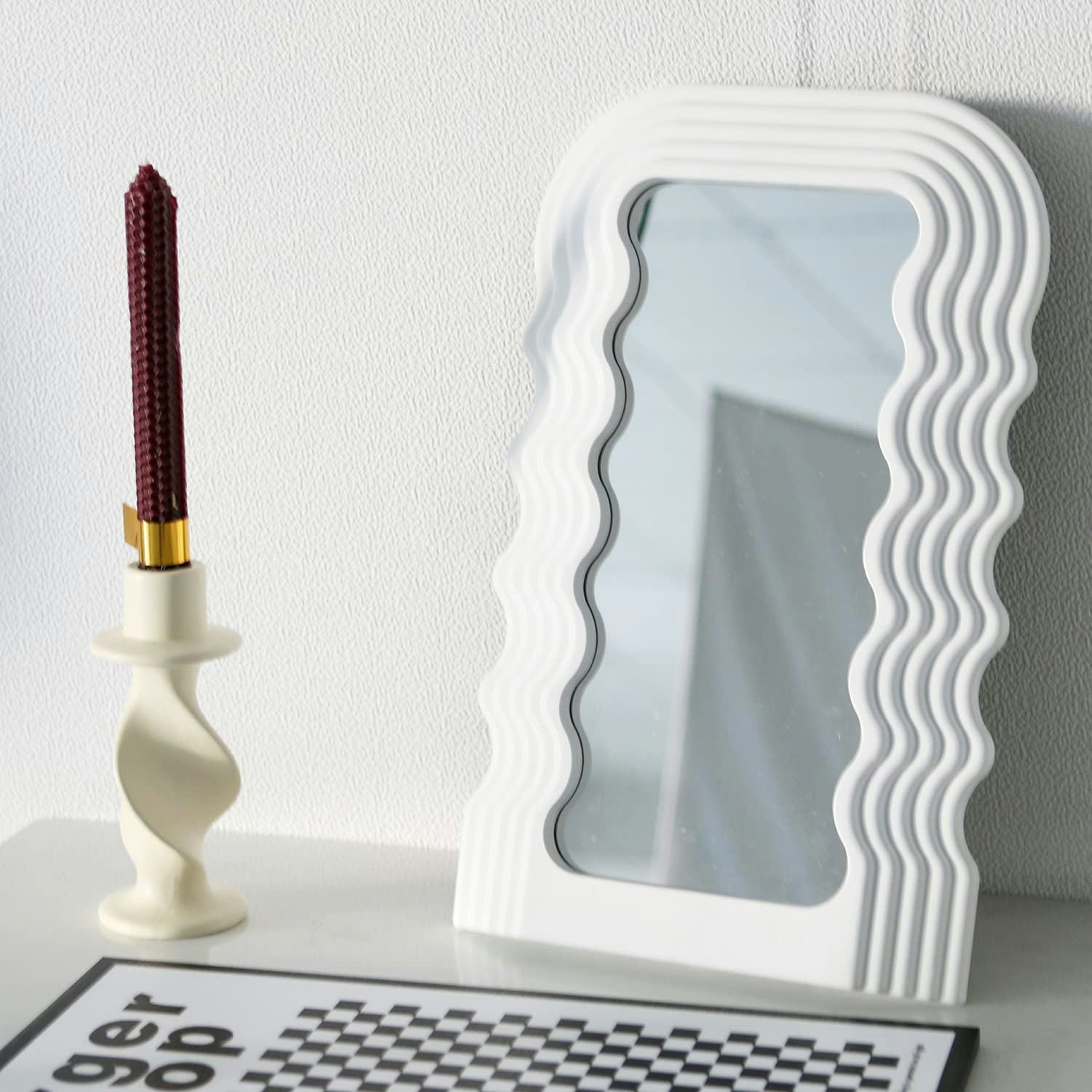 Not only does this mirror come with a funky wavy design, but it’s also small enough to tuck on a bookshelf or to hang it over a small entryway table. It also has a white glossy finish, so the quirky design is still minimalist enough to work with the decor you already have. If white isn’t your vibe, it also comes in eight other colors, including blue and gold.