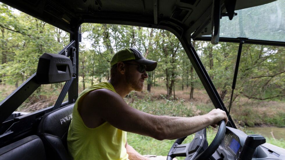 Lieb owns a good chunk of his corn and soybean farm and pays “cash rent” on the rest. Bumping through the woods as he motors around the border of his family’s land, Lieb points out where he has been clearing invasive honeysuckle and other brush from a 30-acre woodland floodplain bordering the creek. He weaves around the corrugated plastic drainpipe he placed throughout the woods to protect the native pecan, oak and hickory trees he planted, just as his father used to do.