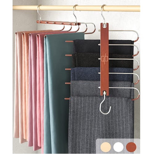 Increase closet space with this five-tier hanger that can be hung horizontally or vertically. It consists of five metal hanging tiers with a nonslip coating that prevents garments from slipping off. The sturdy beechwood bar provides support, and a 360-degree rotating swivel hook allows for easy access to all items. The space-saving hanger supports up to 30 pounds and works well for pants, scarves, and more.