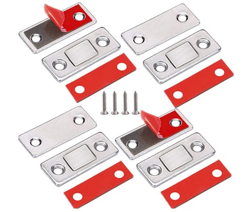 Keep cabinet doors, drawers, sliding wardrobe doors, and more closed with the help of these magnetic cabinet latches. They come in a set of four and are made of ultra-thin steel. The latches use double-sided adhesive tape to attach to a surface, and have a magnet force of 10 pounds to keep doors, drawers, and lids securely shut.
