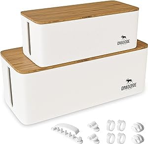 Conceal messy cables in this pair of stylish cable management boxes. The set includes a medium-sized box that fits a 12-inch power strip and a large box that can accommodate a 15-inch power strip. They are made of thick white plastic, the lids feature a beautiful wood print, and the bottoms have nonslip pads. There are cord entry points on the front and back, and the boxes include nine cable management accessories to hold cords in place.