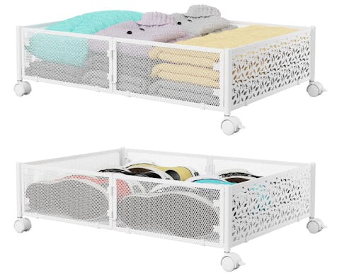 Use these rolling under-bed storage containers to declutter your home and gain extra storage space. The metal containers have open tops for easy access and glide smoothly on four casters, which can be locked in place. They come in a set of two and are collapsible to save space when not in use. You can fit 10 of these under a queen-size bed, and up to 15 under a king-size bed.