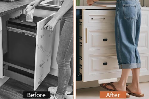 Whether your hands are full or contaminated by raw chicken, this clever cabinet foot pull allows for hands-free operation. It’s made of sturdy white steel and has a matte finish to blend in with different styles of cabinetry. To install the foot pull, you can choose between no-drill self-adhesive mounting and screw mounting — or use both methods to ensure a super strong hold.