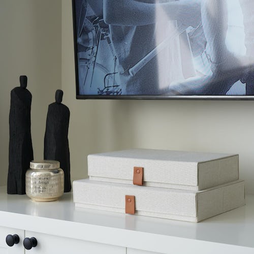 Lori Bitter of Dalia Staging & Design says one of the biggest storage hacks she’s found are these chic linen boxes to organize the classically messy boyfriend or husband drop spot. “The small one is perfect for his dresser or the entry table for keys, wallet, and phone. We’ve even drilled a hole so a charger cord can live in there for the phone or earbuds,” she explains. They look so chic and no one will have any idea of the total mess that’s hiding inside.