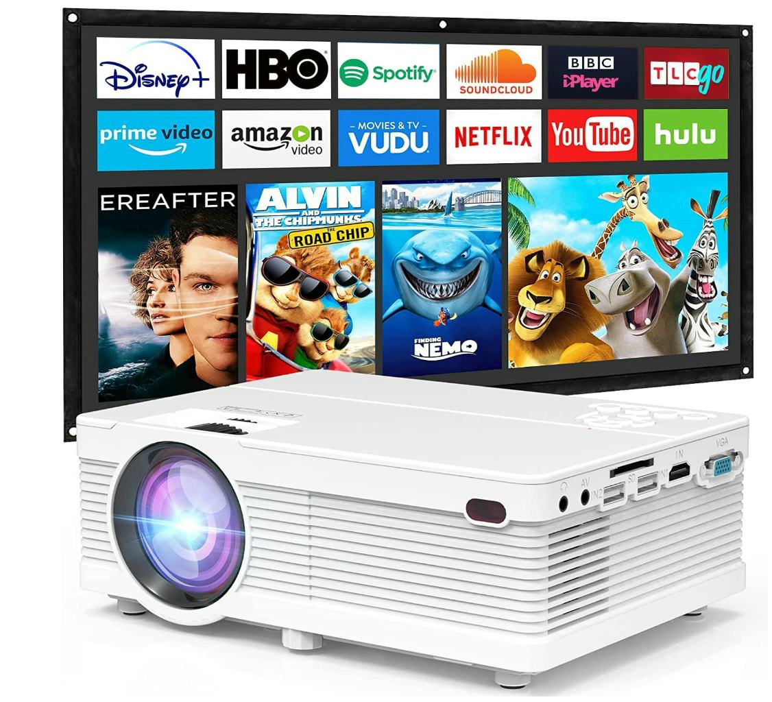 “We use this projector in our living room [...] and it works great!” said one reviewer. “It's handy that it comes with a projector screen [...] power cord, HDMI cable, AV cable, and a remote.”