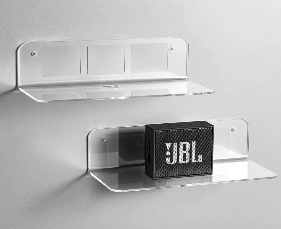 Need a place to set a speaker, security camera, or other small items? These clear acrylic floating shelves are the solution. Peel and stick them to the wall right where you want to set your stuff and they disappear into their surroundings while holding your gear where you need it.