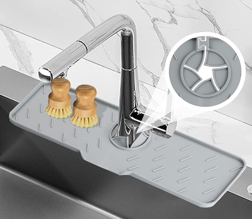“We have a gap between a soapstone counter and the sink, and this product wraps securely around the faucet, protects the gap, and feeds any water back to the sink,” reported one reviewer.