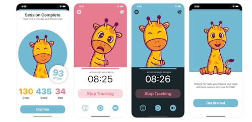 The simple and clean interface lets you set up the app in less than a minute. Once paired with your AirPods, it offers visual, audio or vibration alerts during 10-minute sessions. If you start to slouch, the affectionately-named Rafi the Giraffe will squeak at you to correct your posture. Posture Pal also works in the background and even with music or podcasts playing.