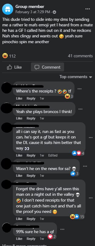 On the Brisbane-focused page, hundreds of posts identify men by their name and photo and ask members for "the tea", or gossip, about them.