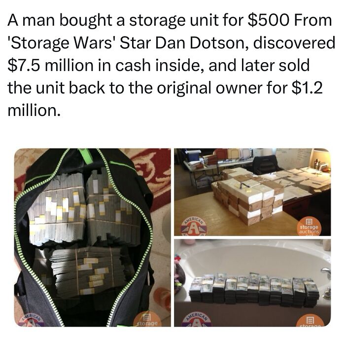 Smart Choice or Horrible Mistake❓ In an amazing turn of events, a man purchased a storage unit for $500 at an auction run by Dan Dotson of Storage Wars. Inside, he discovered a safe containing a staggering $7.5 million in cash. Upon learning of the find, the original owners of the storage unit hired an attorney to negotiate its return. They initially offered the buyer $600,000 as a reward for the money, but after further discussions, the parties agreed on a settlement where the buyer returned the majority of the cash and kept $1.2 million for himself. The buyer made a profit of $1,199,500 on his $500 investment.