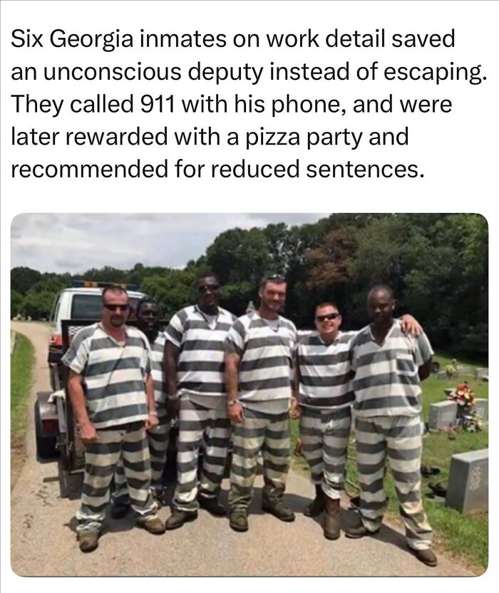 In 2017, six inmates on a work detail in Georgia faced a moment that could have changed everything. While clearing roadside weeds, the sheriff’s deputy supervising them suddenly collapsed, unconscious, his gun at his side. The prisoners could have run. Instead, they chose to save his life. They rushed to his aid, removed his bulletproof vest to help him breathe, and used his phone to call 911. One inmate even attempted CPR while the others flagged down help. By the time paramedics arrived, the deputy was still alive thanks to their quick actions. Officials later confirmed that without them, he likely would have died. The story made national headlines. The men were honored at the jail with a pizza party, and local authorities recommended reduced sentences as a reward. What could have been a tragedy became a reminder that even behind bars, people are defined by their choices-and in that moment, these inmates chose humanity over freedom.