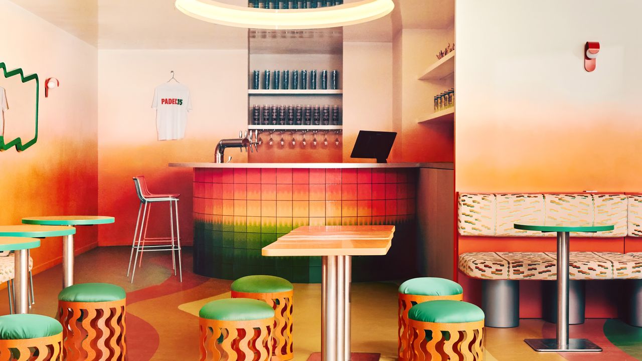 Think rainbow, gradient floors, bold contrast in interior design, and walls hinting at the grass and clay courts so ubiquitous in other racket sports, and sleek bar surfaces crafted with the help of premium tile manufacturers, Palet. A playful cartography of waves, expanding from the ground to the ceiling, and shifting from emerald green to burned orange, ochre, and cream, is PADEL15's most distinctive trait.