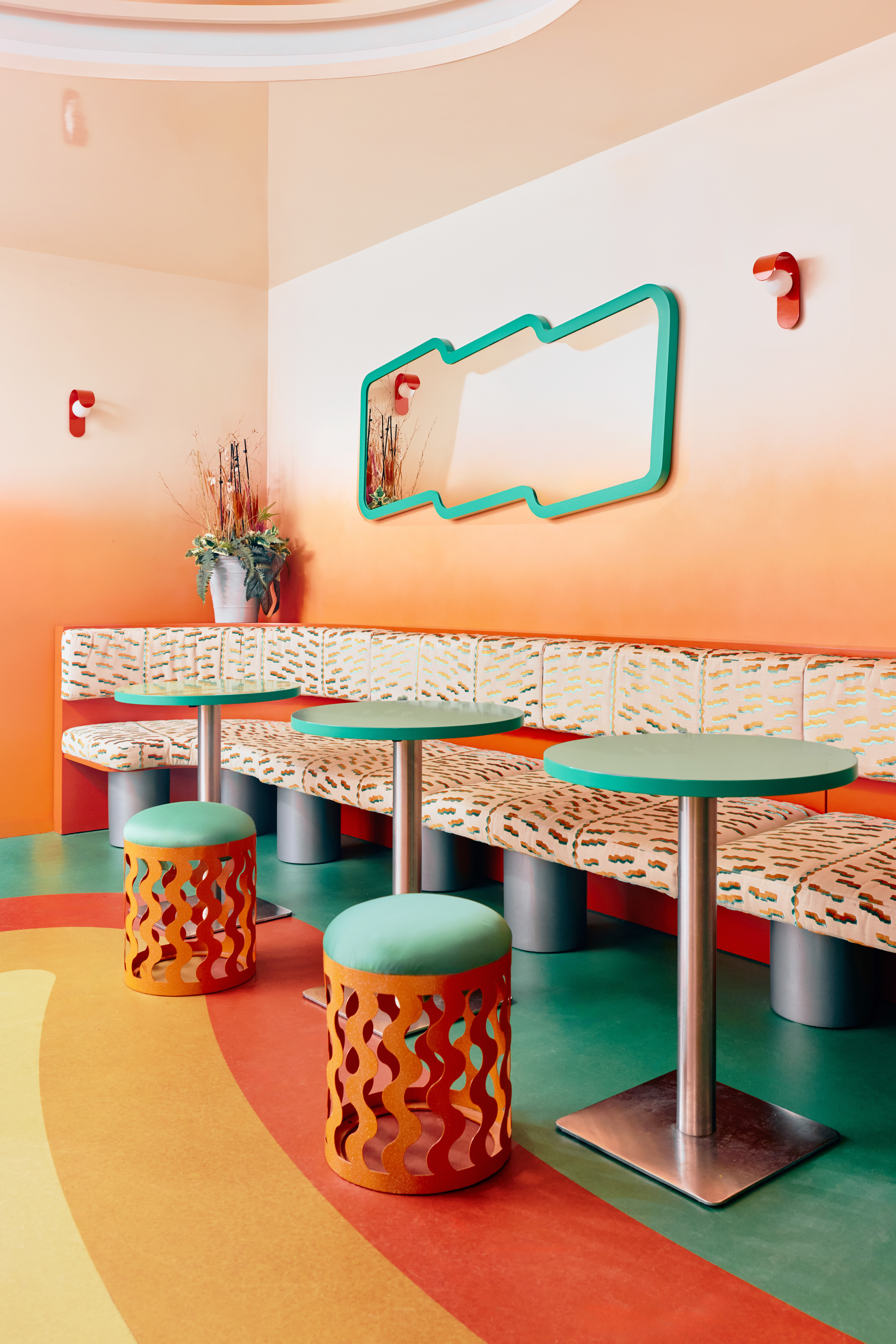 It's dopamine decor with an artisanal feel that of this new Parisian hangout, where bespoke perforated orange stools, graphic cushions, and cocooning banquettes create an atmosphere suspended between the comfort of home and an alternate, dream-like environment.