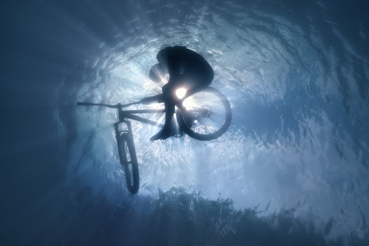 In one of his most challenging shots, he used a ladder and a rope to position a light over the water, then headed underneath the water to capture a shot of an athlete and bike perfectly framed by blue water and light.