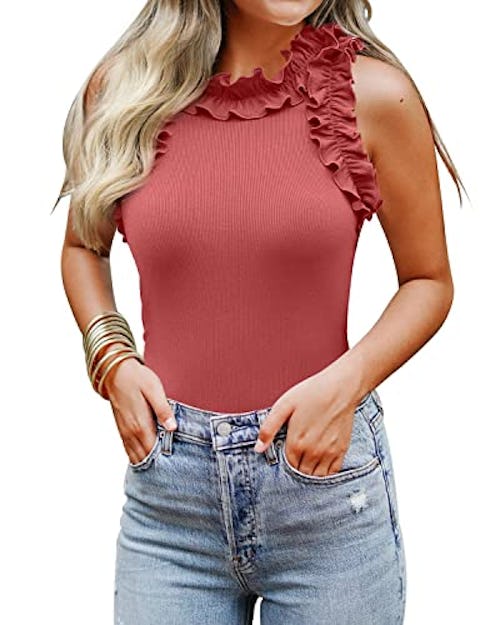 WAYMAKER Womens Ruffled Tank Top Body Suits Cute Summer Ribbed Turtle Neck Bodysuit Brick Red Medium