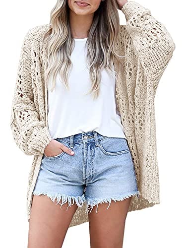 Mafulus Women's Crochet Cardigan Kimono Boho Long Sleeve Lightweight Soft Oversized Open Front Knitted Sweater Beige