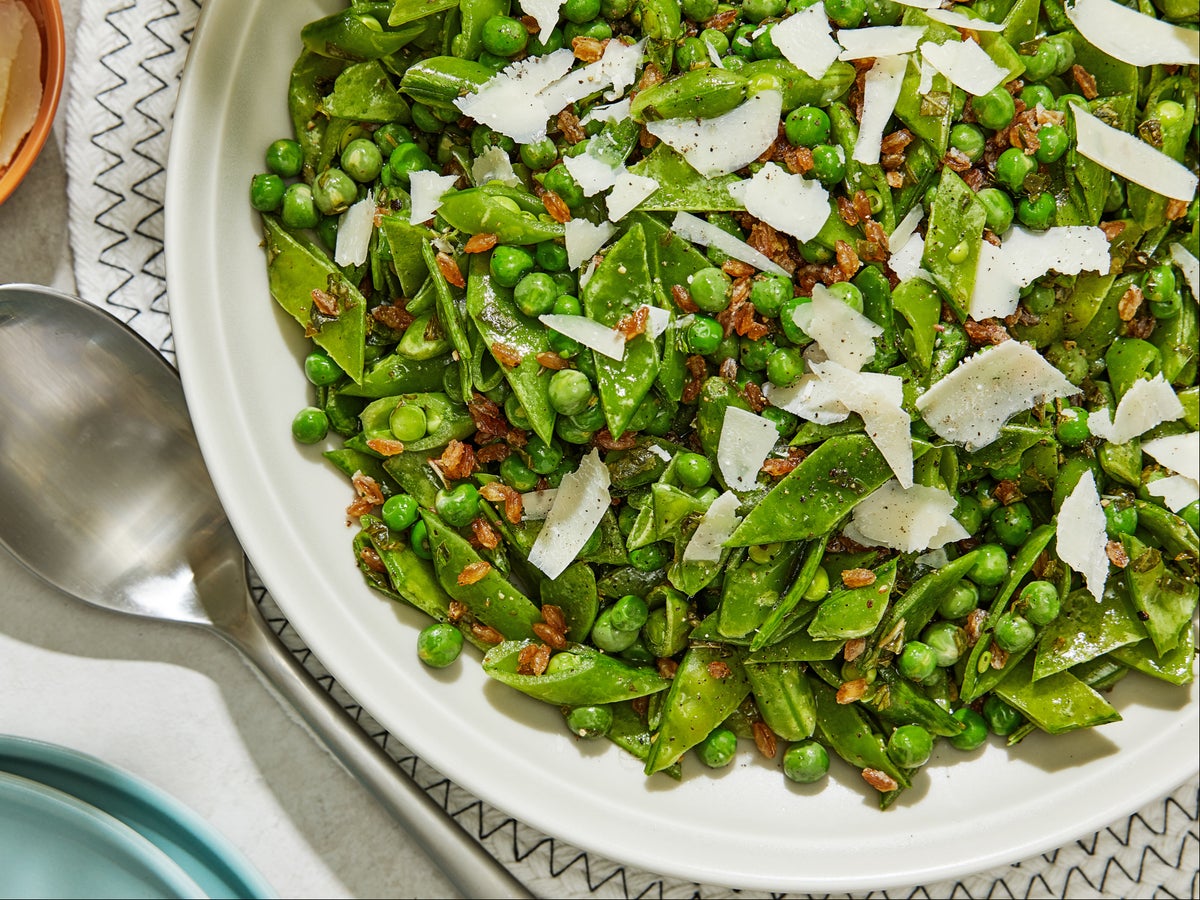 This might be the crunchiest salad you’ve ever eaten. It’s a true riot of textures from three kinds of peas (English, snap and snow), plus fried farro, in a simple, tart, herbaceous dressing. Shaved parmesan cheese provides another counterpoint, but this salad would also be great with a creamier cheese, such as burrata or feta, or with salty ricotta salata. You can also substitute a vegan cheese of your choice; consider dollops of creamy vegan ricotta or feta.