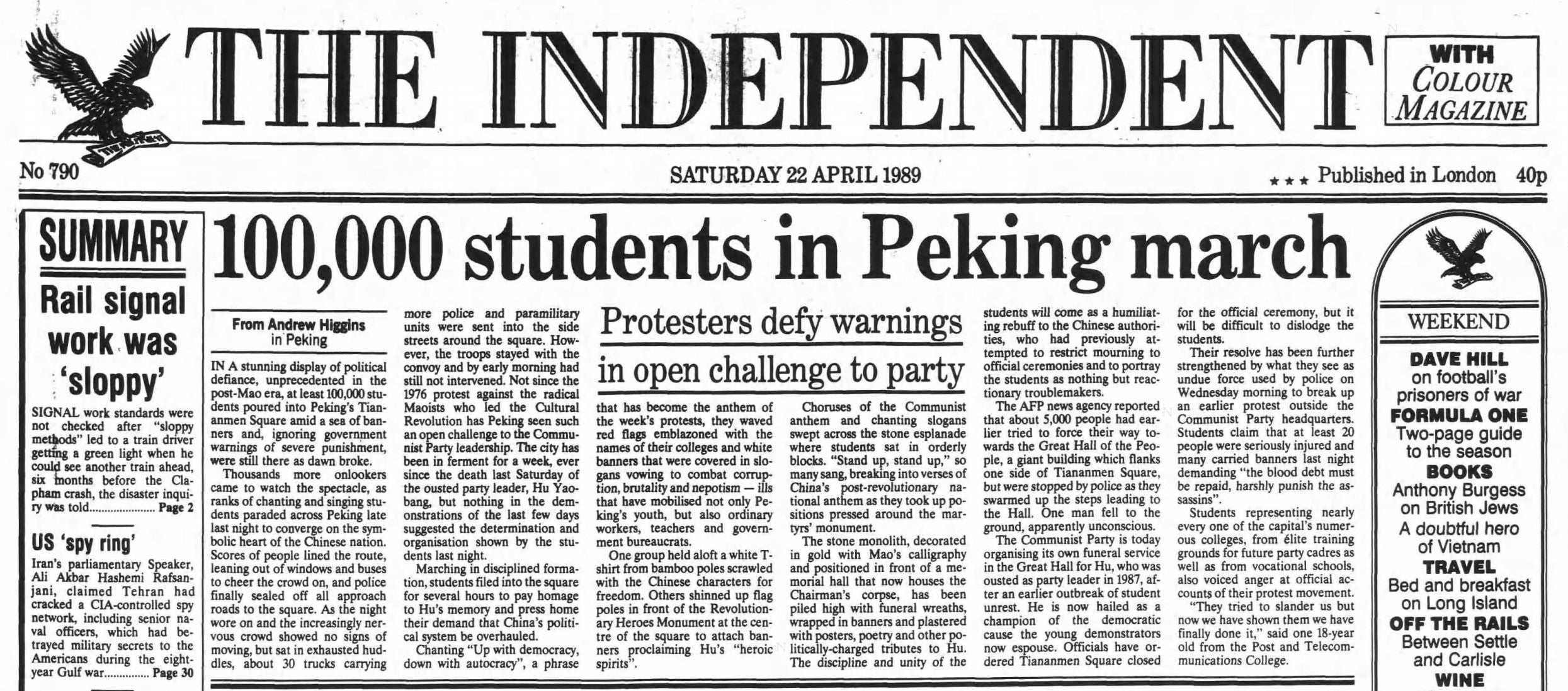 In a “stunning display of political defiance”, at least 100,000 students ignore government warnings of severe punishment to occupy Peking’s Tiananmen Square. Although 30 trucks of police and paramilitary units do not intervene at this stage, these protests would reach a tragic boiling point just months later in the violent military crackdown known as the Tiananmen Square massacre.