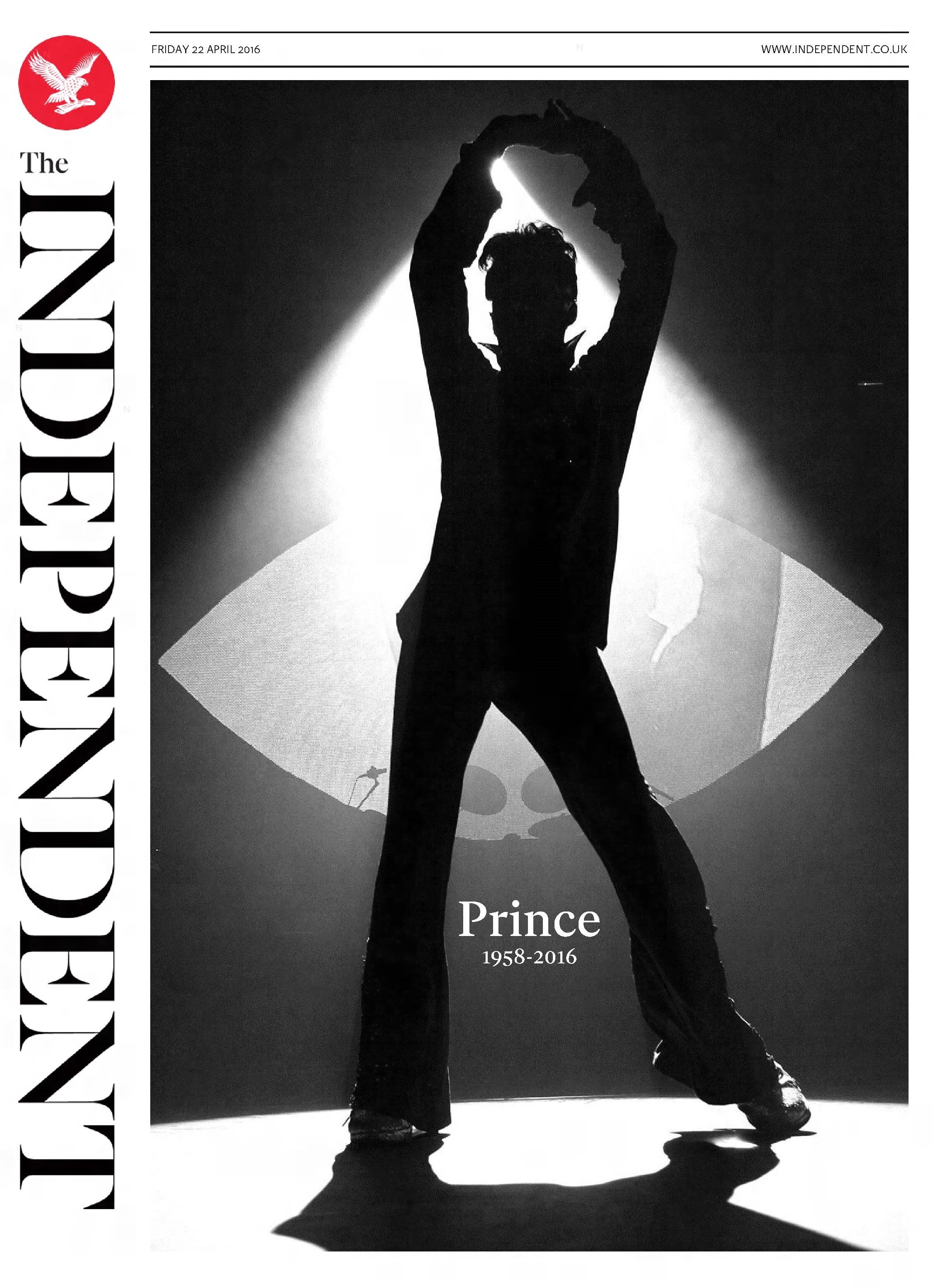 The Independent clears its front page to run a striking, full-page photographic tribute to the legendary musician Prince following his sudden death at the age of 57. The shocking loss of the genre-defying pop icon at his Paisley Park estate prompted an immediate outpouring of global grief, celebrating a singular artist who shaped modern music and fashion.