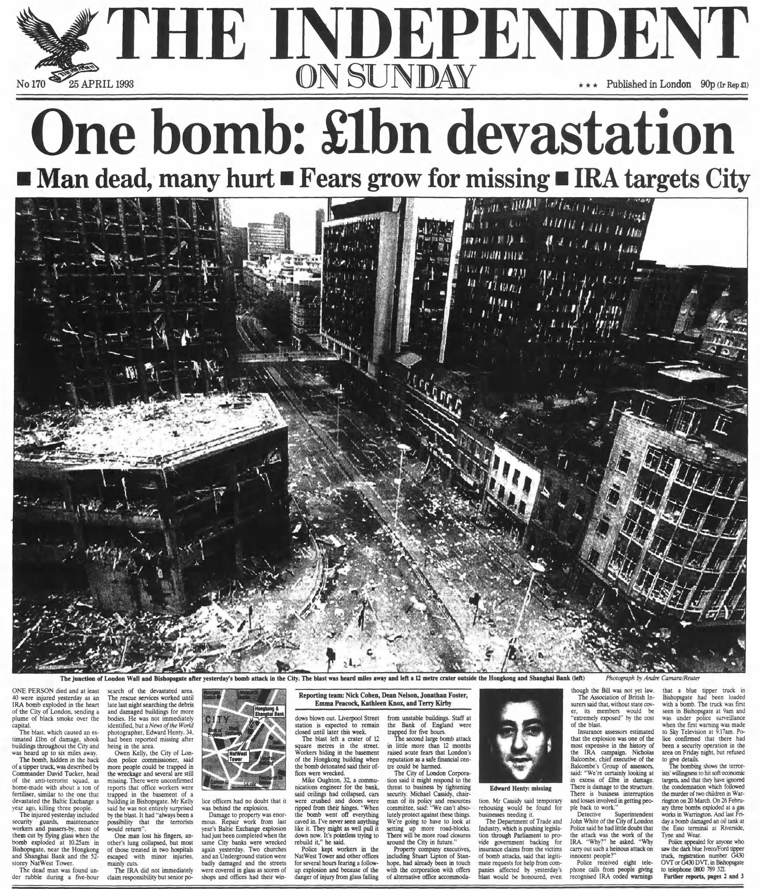 An IRA bomb hidden in the back of a tipper truck explodes in the heart of the City of London, killing one person and injuring at least 40 others. The massive blast, heard up to six miles away, leaves behind an estimated "£1bn devastation" across the financial district, sparking frantic rescue efforts as fears grow for those missing in the rubble.