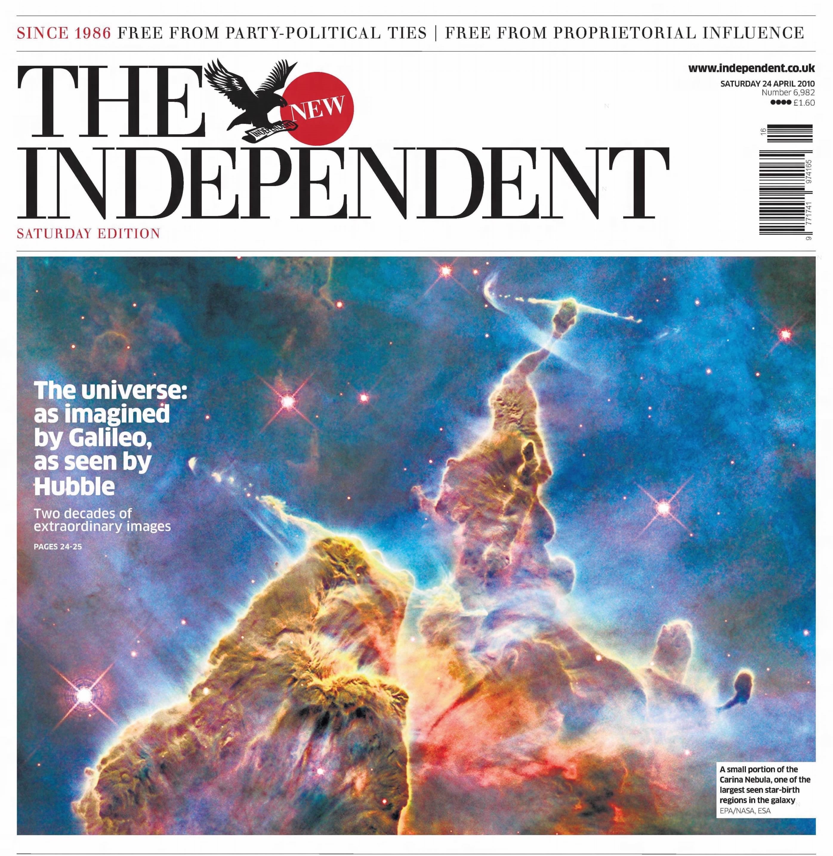 Marking the 20th anniversary of the Hubble Space Telescope, this front page celebrates two decades of extraordinary space photography that reveals the universe "imagined by Galileo, as seen by Hubble." The striking cover is dominated by a newly released photograph of the Carina Nebula, capturing one of the largest seen star-birth regions in the galaxy.