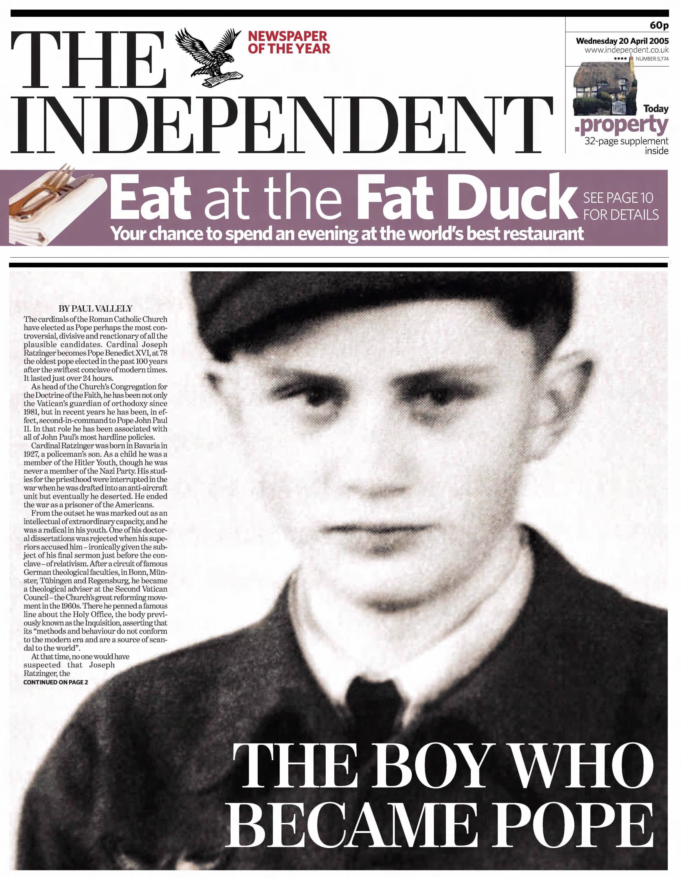 Following a swift 24-hour conclave, 78-year-old Cardinal Joseph Ratzinger is elected as Pope Benedict XVI, becoming the oldest pontiff in a century. Described by The Independent as a "controversial, divisive and reactionary" choice, the new Pope is closely associated with the hardline policies of his predecessor and faces immediate public scrutiny over his childhood membership in the Hitler Youth.