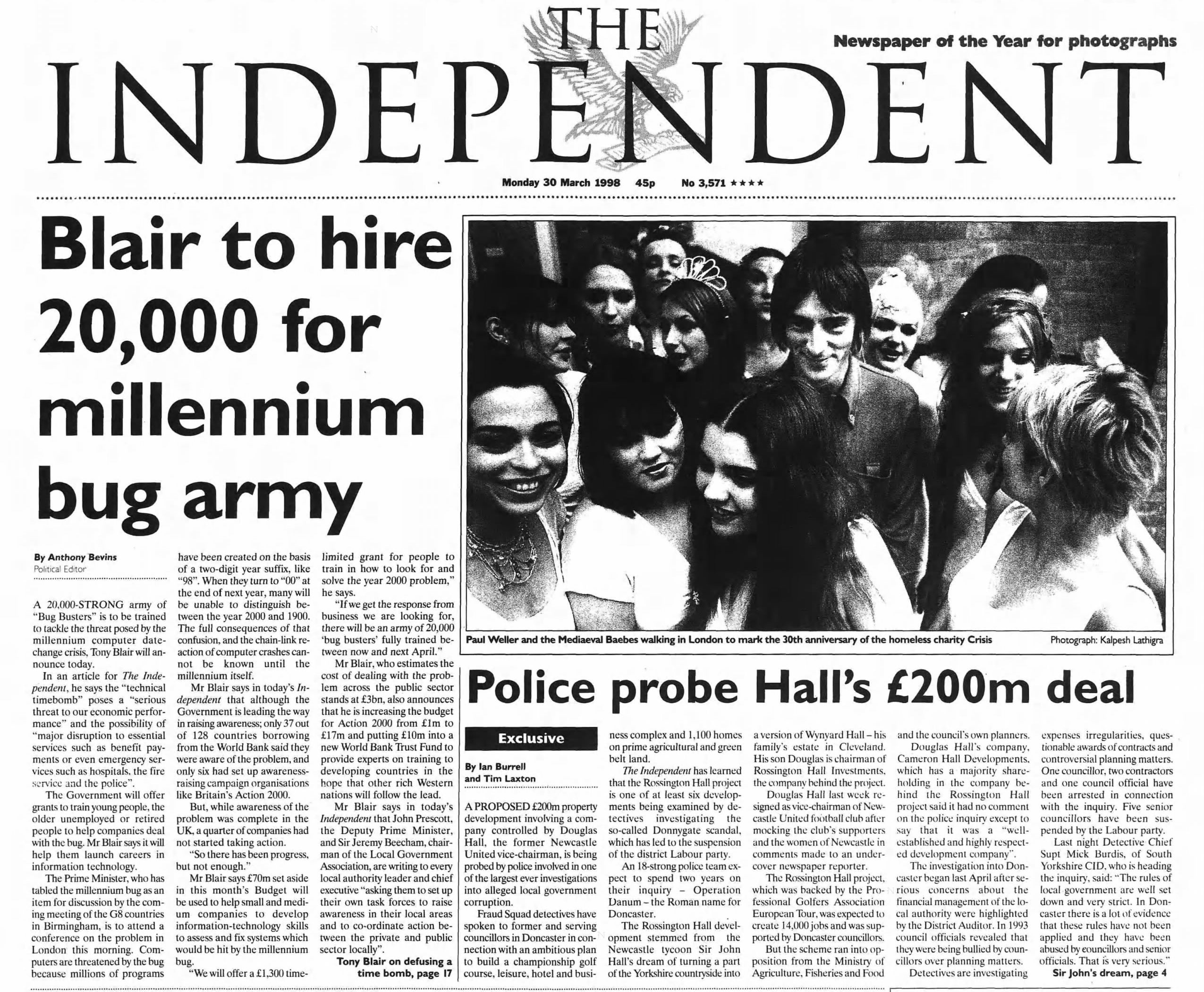 Tony Blair reveals plans to train a 20,000-strong army of “bug busters” to tackle the impending millennium computer date-change crisis. Writing in The Independent, the prime minister outlines government grants to train young, unemployed and retired citizens to prevent the “technical timebomb” from causing major disruption. Less than two years later, the turn of the millennium ultimately arrives without catastrophe.