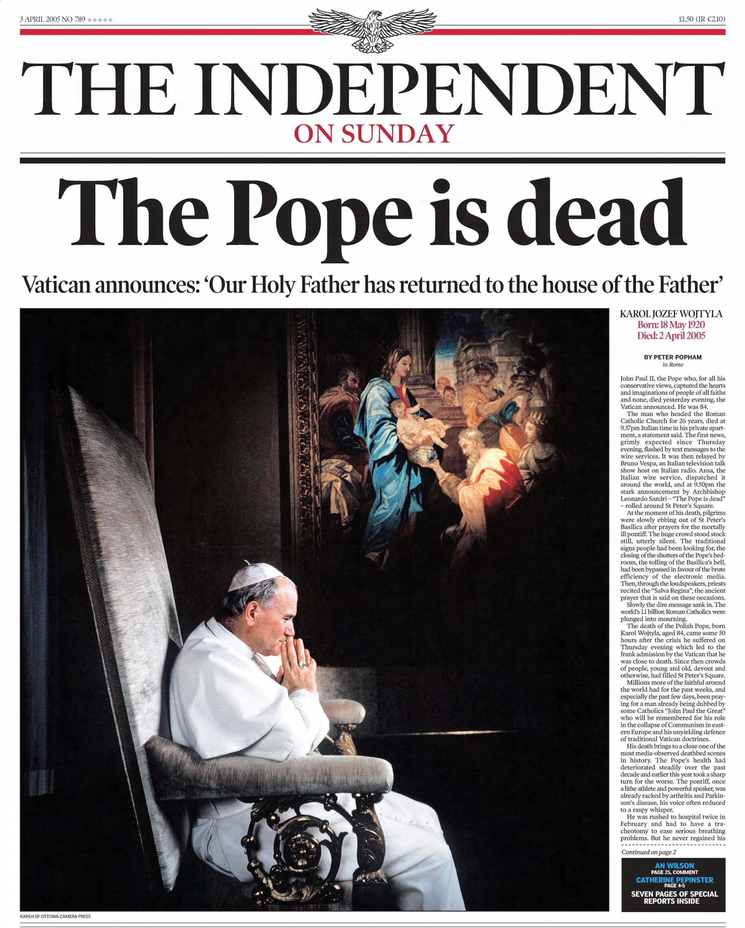 The Vatican announces the death of Pope John Paul II at the age of 84, bringing a close to his historic 26-year papacy. Following a highly publicised decline in the pontiff’s health, The Independent reports he is mourned globally by millions across all faiths despite his staunchly conservative views. His passing soon draws one of the largest gatherings of world leaders in history for his funeral, paving the way for the election of his successor, Pope Benedict XVI.