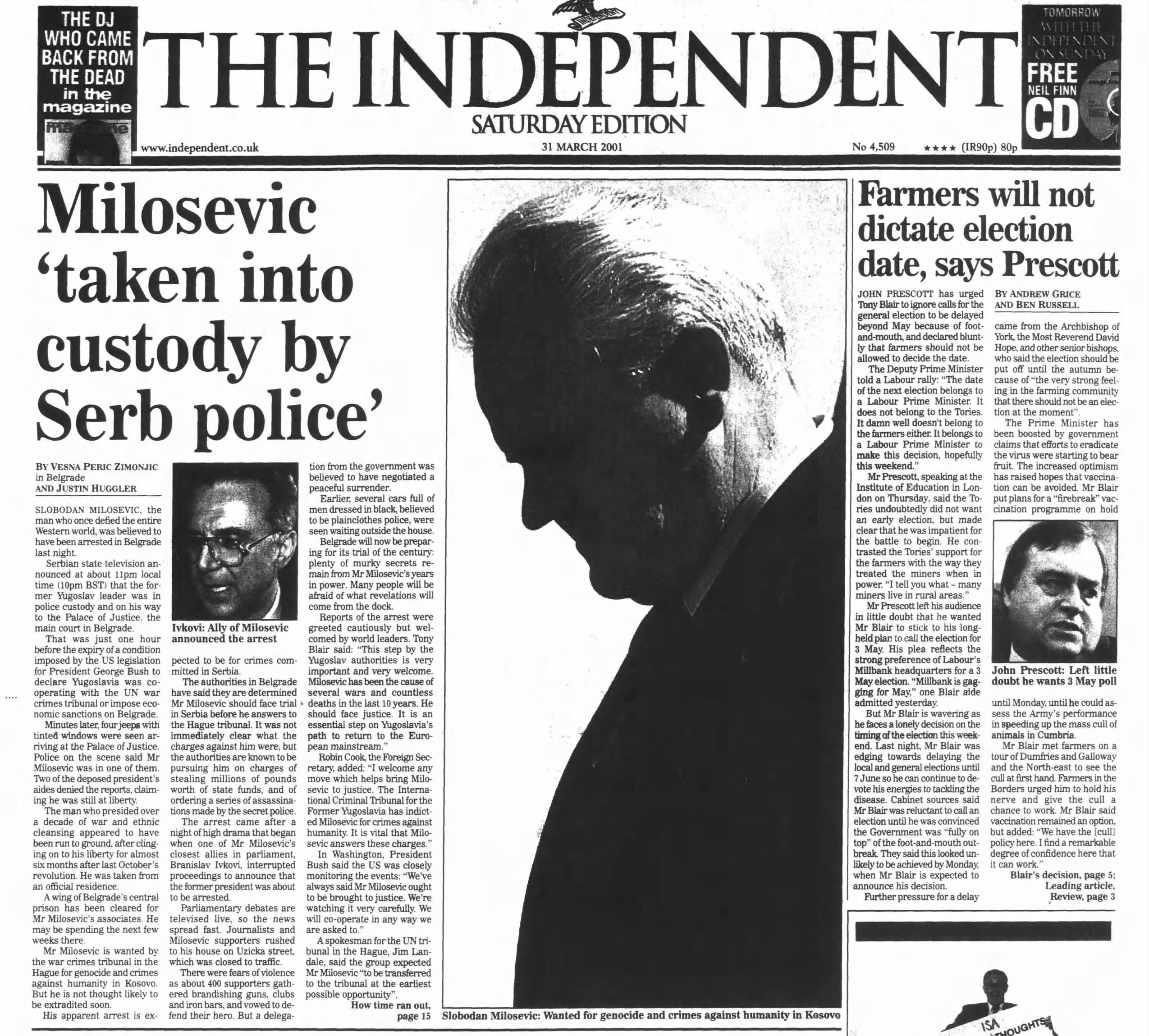 Serbian state television announces the arrest of former Yugoslav president Slobodan Milosevic in Belgrade. The detention occurs just one hour before the expiry of a US deadline threatening heavy economic sanctions if the country fails to cooperate with the UN war crimes tribunal. He is later extradited to The Hague to face trial for crimes against humanity, but ultimately dies in his cell in 2006 before a verdict can be reached.