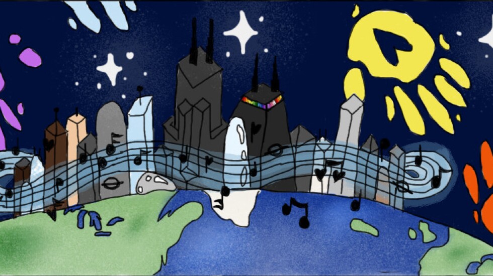 Her drawing includes hands of different colors, with hearts centered in the palms, floating in the night sky above a globe on which the Chicago skyline is perched.