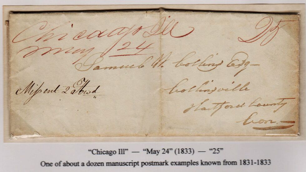 Because Chicago was such a backwater, it didn’t at first have its own postal stamp. So outgoing mail was postmarked and dated by hand from 1832 through much of the following year. One of the earliest items set to be auctioned features faded red fountain pen looping across an envelope mailed in 1833 from Chicago to Connecticut.