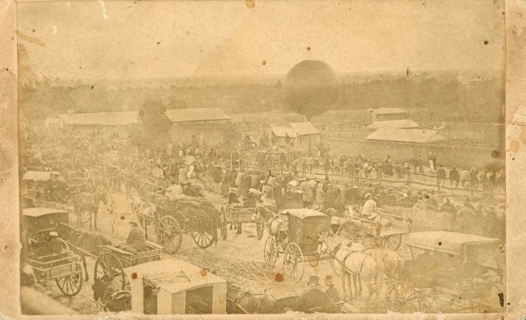 A crowd in the Adelaide Parklands picnics on cold cuts and pigeon pies as a large balloon slowly rises into the sky.
