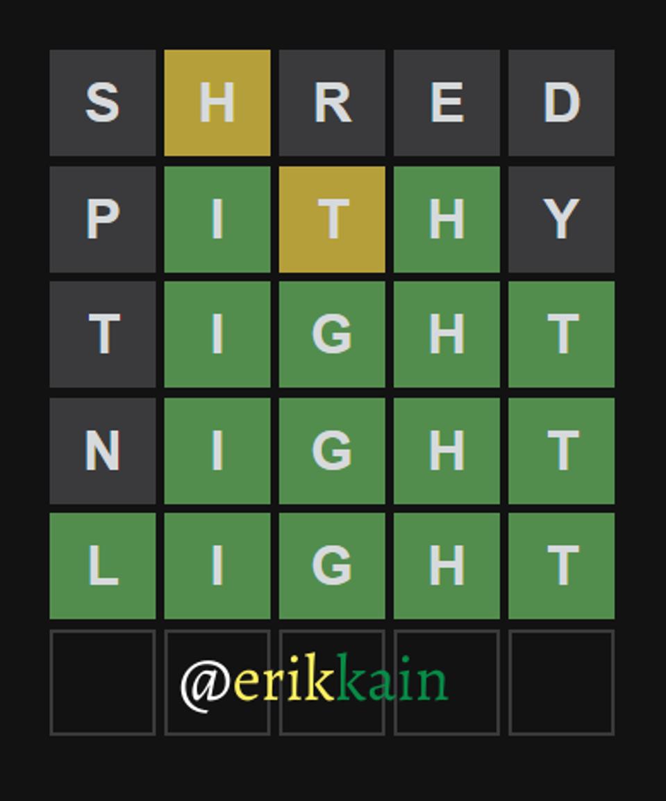 Still, even thought ‘NIGHT’ was also off the mark, I came to the ‘LIGHT’ before wasting any guesses on ‘FIGHT’ or ‘BIGHT’ (yes, it’s a thing and it doesn’t mean ‘BITE’) or ‘MIGHT’ or ‘WIGHT’—a word, had I used it for my final guess, that would have haunted me to my core.