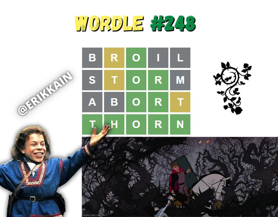 “On this uniform palindromic day (lots of 2’s) in a wondrously palindromic week, we get the word thorn from Wordle. Derived from an Old English word, thorn relates to a prickly plant. So you have pricklespine and thorn all roughly meaning the same thing (but with different word histories). You’re more likely to hear about a “prickly personality” and a “thorny problem” than a “spiny situation,” though that’s possible. St. Paul gave us the interesting thorn metaphor when he spoke of being given “a thorn in the flesh” so that he might not be too puffed up. The thorn is a tiny thing, but we all know how it can stop the toughest among us. Consider the fable of Androcles and the lion, where a mighty beast is rescued when a man pulls a thorn from his paw. Years later, this same lion decides not to devour Androcles out of his gratitude. Which shows you that a thorny problem may just lead to something good.”