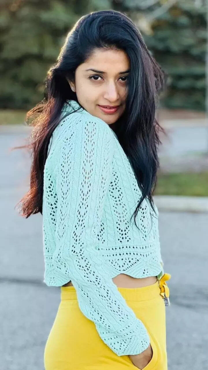 Meera Jasmine in the blue knit sweater and yellow pants look is bookmark-worthy.