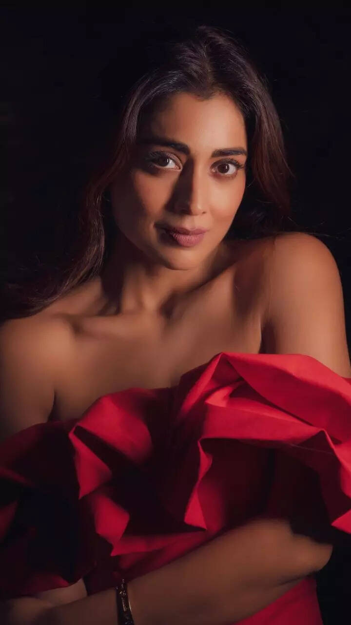 Shriya Saran looks like a dream in a red off-shoulder dress.