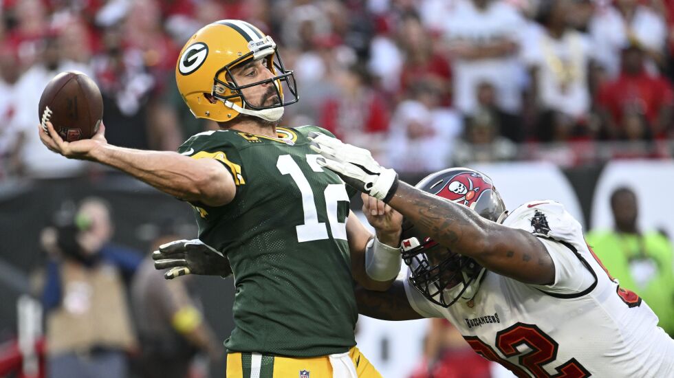 Rodgers tossed TD passes of 5 yards to Romeo Doubs and 6 yards to Allen Lazard on his team’s first two possessions, while the Bucs’ offense sputtered much of the day without star receivers Mike Evans, Chris Godwin and Julio Jones.