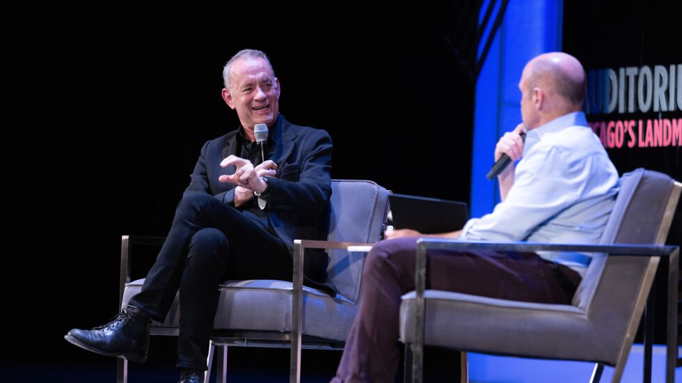 Taking the stage, Hanks immediately established his Chicago bona fides: “I didn’t realize that Tesla — not the car guy — and Booker T. Washington had once appeared at the Auditorium.” He rattled off the four movies he’s made in the area: “Nothing in Common” (1986), “A League of Their Own” (1992), “Sleepless in Seattle” (1993) and “Road to Perdition” (2002).