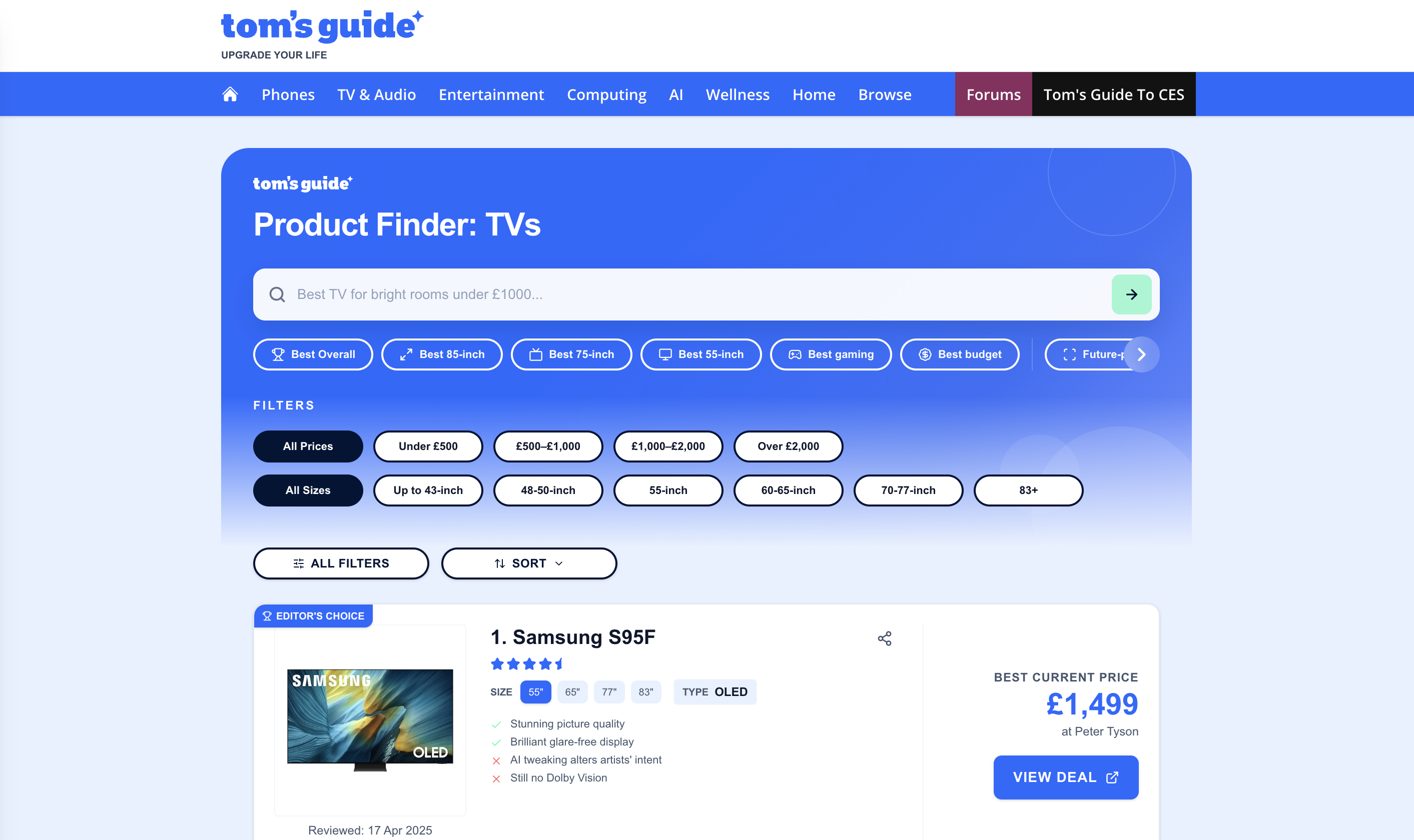 The new product finder tool, uses existing Tom's Guide reviews and guides to help narrow down your search. Currently trained for just TV models, the tool lets you filter by brand, price and size, but also just type what you need.