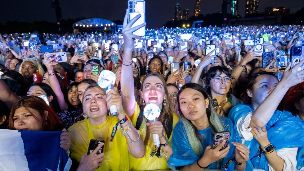 Tomorrow x Together also famously played the fest in 2022, at Perry’s Stage, though the group’s performance Saturday was a major upgrade. The five members remarked on the back-to-back appearances, saying, “It’s such an honor to be here again. … Chicago is a very special place for Tomorrow X Together,” and adding, “It reminds us of last year, one of the most meaningful, memorable concerts we’ve performed.”