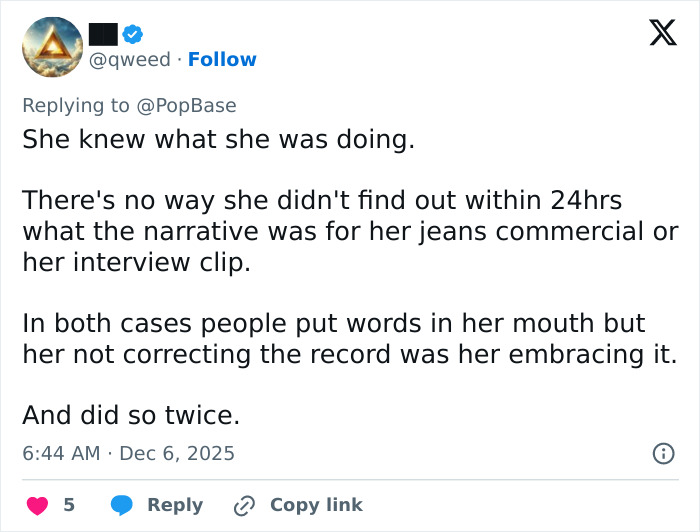 Another joked, “Sydney Sweeney: ‘I just liked the jeans.’ Internet: ‘So anyway, here’s a conspiracy theory.’ Bro she can’t even wear denim without triggering a lore dump.”