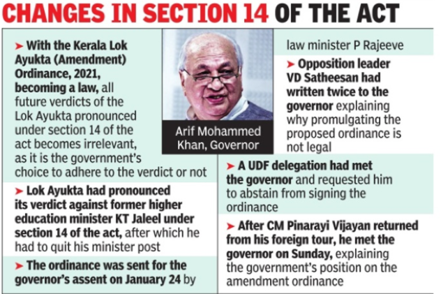 THIRUVANANTHAPURAM: Governor Arif Mohammed Khan on Monday signed the ordinance proposing amendments to the Kerala Lok Ayukta Act, 1999, rendering the Lok Ayukta orders not binding on the government. Chief minister Pinarayi Vijayan had met the governor for more than an hour on Sunday and explained the government's position on the matter.