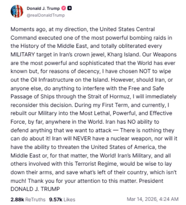 Trump announced the operation in a Truth Social post late Friday (US local time). “Moments ago, at my direction, the United States Central Command executed one of the most powerful bombing raids in the History of the Middle East, and totally obliterated every MILITARY target in Iran's crown jewel, Kharg Island,” Trump wrote.