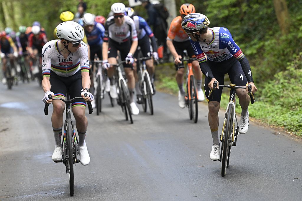 Torrential downpours suddenly hit the race from time to time, but that didn't stop the 17-strong chase group squeezing hard, with Pogačar leading on the Valkenberg, then teammate Florian Vermeersch pushing on immediately afterwards. At 78 kilometres to go, the 17 reached the 11 ahead, forming a group of 28. It was intriguing to see how keen Evenepoel was to take a turn on the front, given his inexperience in this larger group, but that was perhaps also a sign of his ambition on such hallowed racing terrain for Belgian fans.