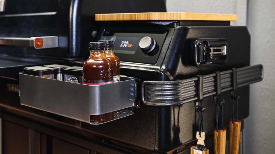 There's tons of storage underneath the Timberline as well, with room for extra pellets and accessories. There's even a shelf that's the perfect size to keep all your Traeger rubs and sauces. There's a tool rack on the side of the pellet hopper and the MEATER probes have their own magnetic dock.
