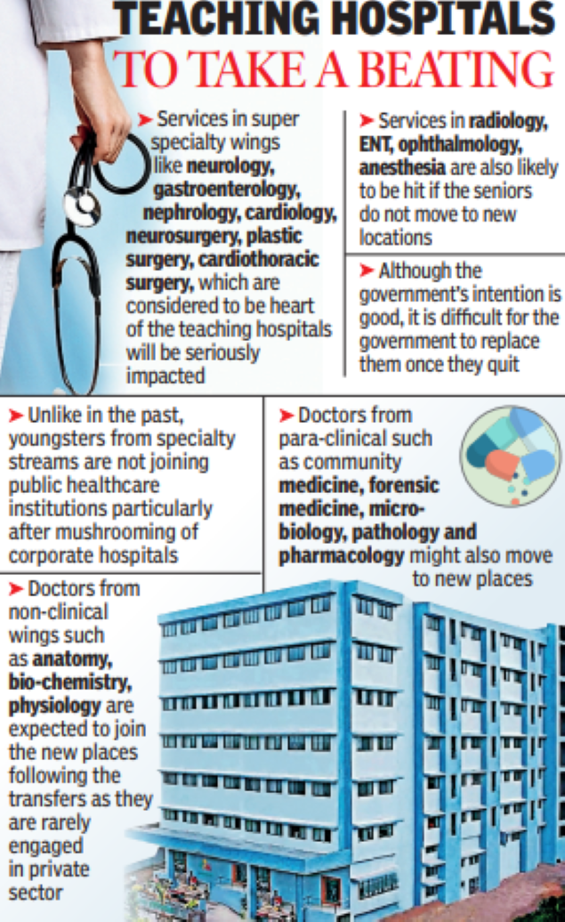 Sources said that senior professors who were shifted to faraway places may quit service. Similarly, a good number of associate and assistant professors in super specialty wings are also planning to quit as they have already made decent revenues from private practice. Although, there is a ban on private practice of government doctors, these doctors established their own hospitals with strong network as majority of them have been working in their home towns for over a decade without any transfer.