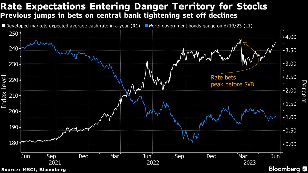 US 10-year yields rose three basis points, after similar-maturity UK yields jumped eight basis points to their highest since September. Traders are betting the average central bank rate in developed markets will rise to 3.82% in a year, the highest forecast since early March. That means they have effectively priced out bets the financial-market stress that erupted with the collapse of Silicon Valley Bank will persuade policymakers to stop tightening.